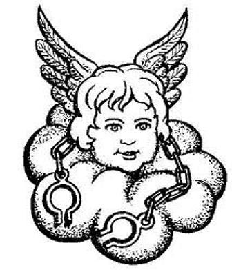 | Une dague coincée dans une bandoulière. Indique une condamnation pour un crime contre un agent de la force publique. Déchiffré comme "mort aux flics". |