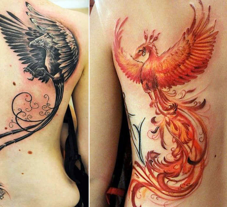 Les amateurs d'images mystiques préfèrent l'aquarelle de phénix, la luminosité de ce type d'image imitant une peinture à l'eau réalisée au pinceau. La beauté du tatouage féminin symbolise l'amour, la loyauté et la fidélité. L'ajout de l'image du dragon pourrait être considéré comme une manifestation de l'interaction entre la féminité et la masculinité (Yin et Yang).