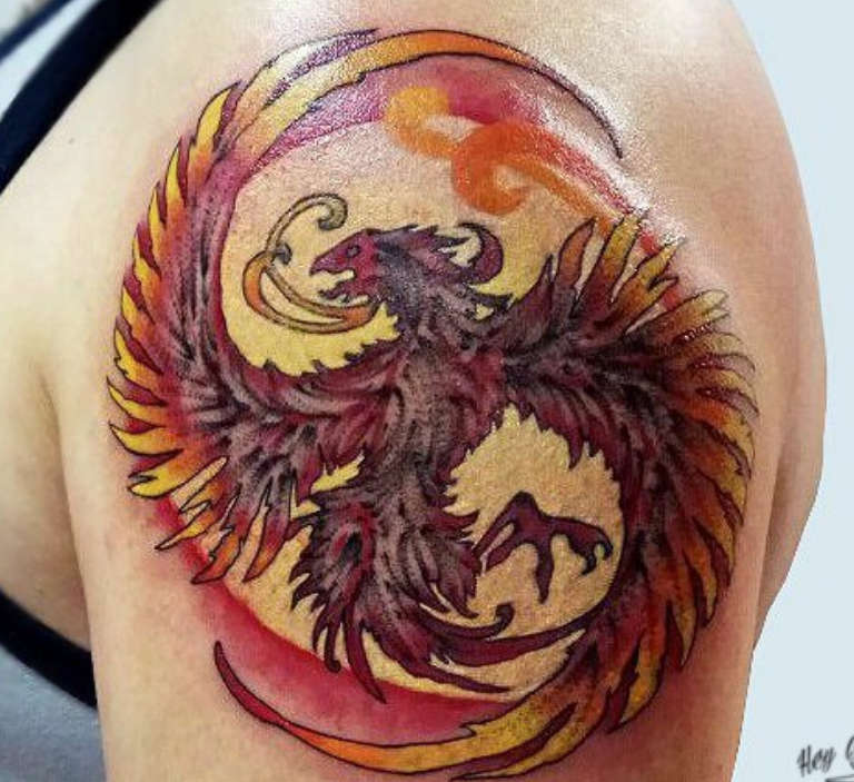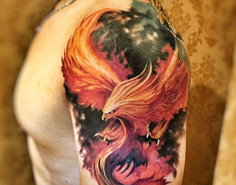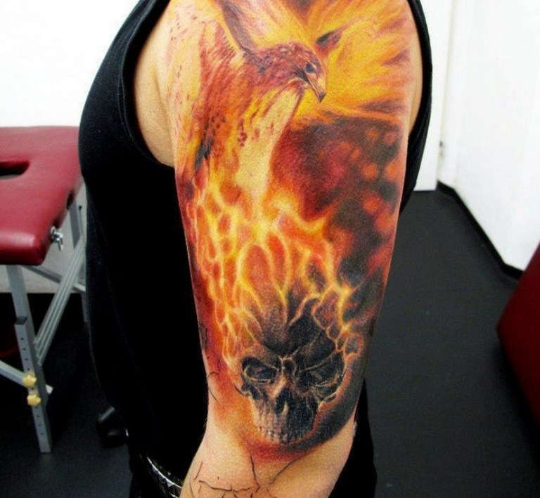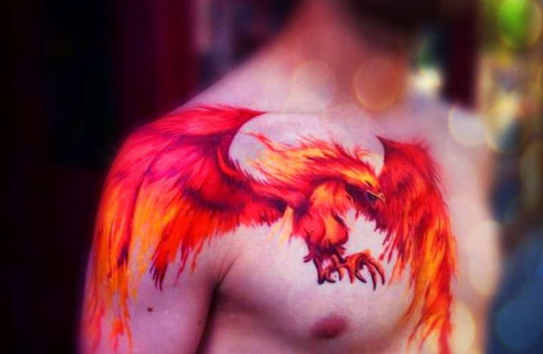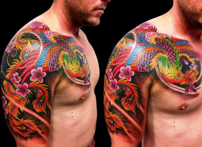 Un phénix sur l'épaule est une aide pour un homme, qui le soutient dans les situations difficiles. Le tatouage est nécessaire pour rendre un homme fiable, stable, capable de protéger sa famille.
