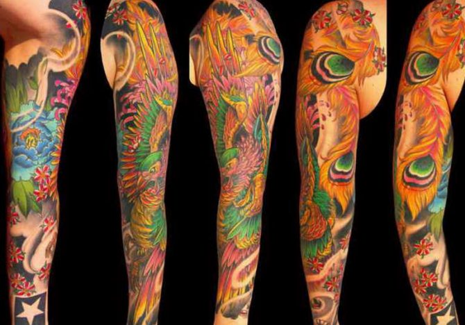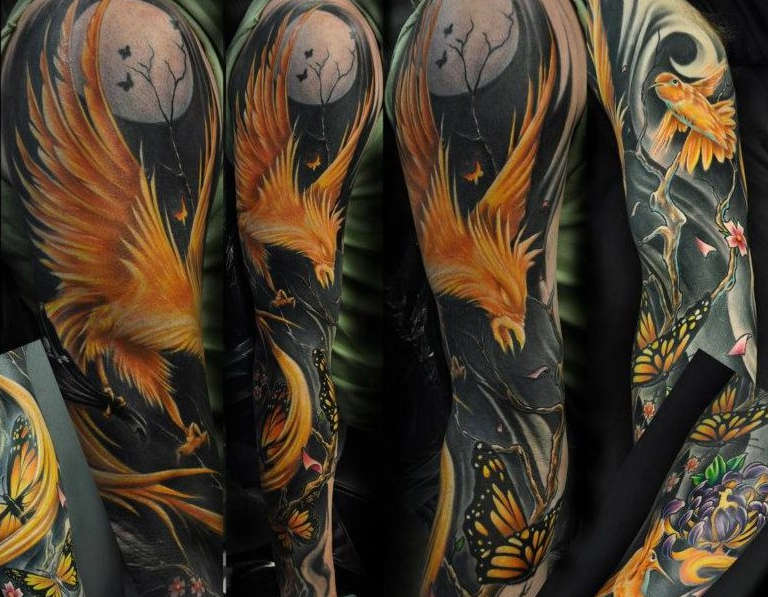 Une manche est un tatouage qui couvre tout l'espace sur les bras d'un homme. Dans ce cas, le phénix est le symbole du désir d'indépendance, de liberté et de spiritualité d'un homme. De même, les tatouages sur les bras sont une démonstration de traits de caractère forts.