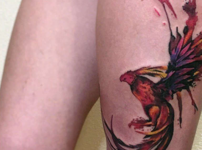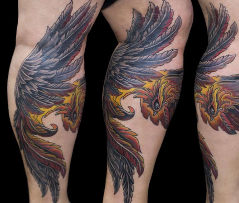 Le phénix sur les cuisses est souvent réalisé par les filles, mais les hommes rencontrent également de tels motifs sur leurs cuisses. Elles signifient l'amour de la vie, la sagesse et l'intelligence, un cœur brûlant de passion et d'émotion, le désir de l'homme de fonder une famille et d'avoir une descendance.