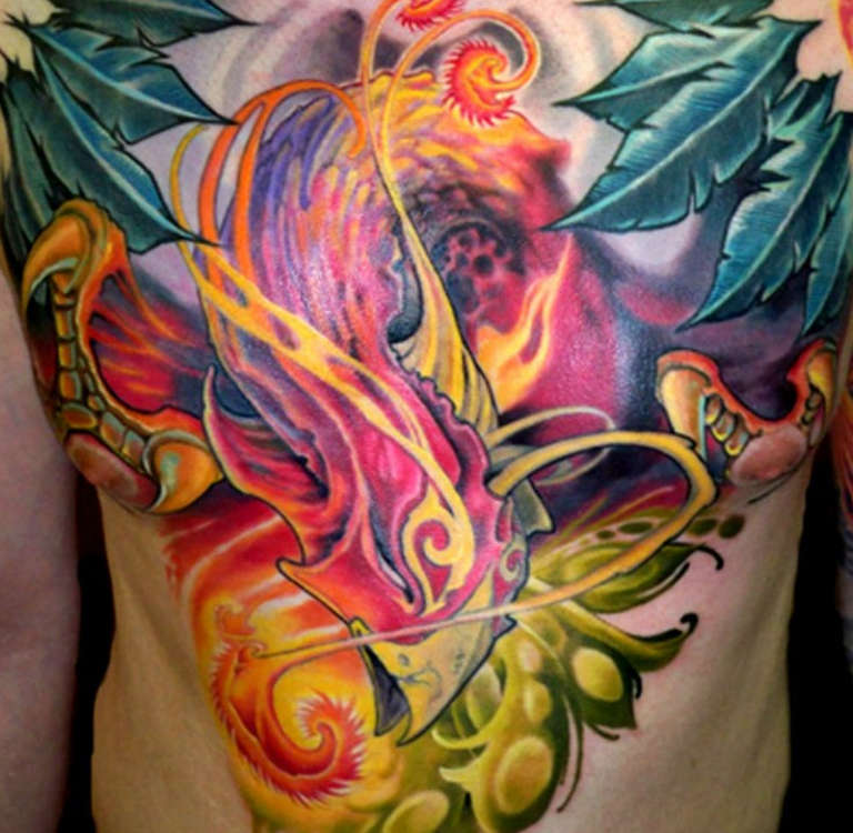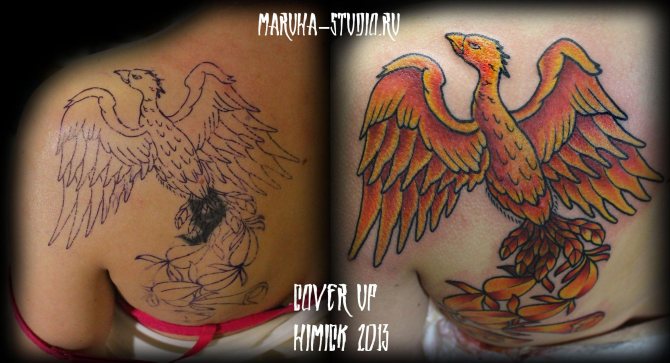 - dos, poitrine, avant-bras, bras et jambes - Pour ces zones, il est préférable de choisir de grandes esquisses colorées sous forme de compositions avec des symboles, des détails et d'autres éléments supplémentaires, tels que le phénix qui s'envole, le phénix en tandem avec d'autres créatures, etc ;