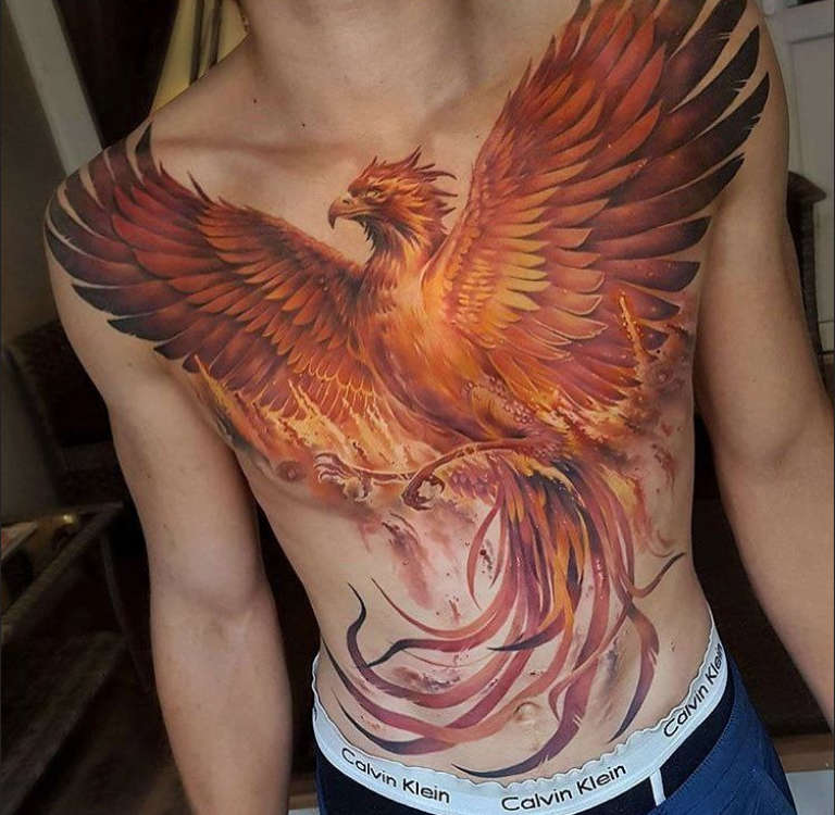 Le phénix renaissant des flammes - Dans ce dessin sur le corps, la flamme représente la mort et le phénix agit comme un symbole de renaissance à partir du feu, de vie et d'immortalité.