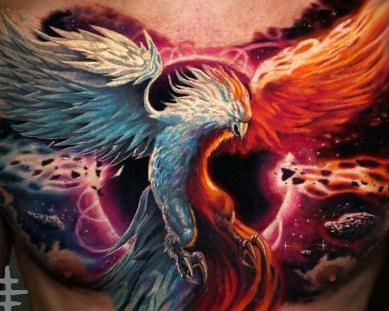 Aujourd'hui, le phénix est un symbole à la fois de la répétition et de la nature cyclique de la vie humaine, avec une signification sacrée profonde et une couleur sous forme de tatouage sur le corps. Le tatouage suggère que tout dans la vie revient et se répète. Et les hommes se font tatouer un phénix pour faire face aux obstacles de la vie, pour entretenir la force d'esprit, la résilience.