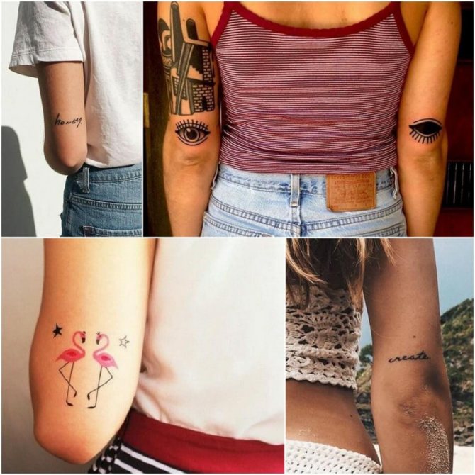 Les filles préfèrent décorer leurs coudes avec des petites lettres, des ornements et des fleurs. Un tatouage sur le coude, surtout une petite inscription ou un signe, ne se remarque pas, mais il est très élégant. Cette combinaison plaît à de nombreuses filles. Bien que les options de tatouages vifs et audacieux sur le coude deviennent également le choix des femmes.