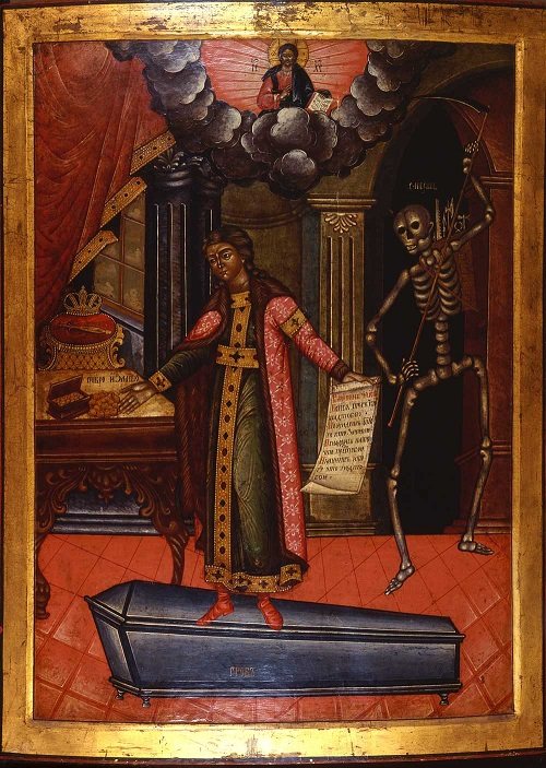 L'auteur d'une des icônes instructives sur le thème de la mortalité de la vie a même été appelé le célèbre iconographe Simon Ushakov. Elle représente la même scène que la première version, mais ajoute plusieurs détails : les sirènes sur le meuble sont une allégorie de la tentation, à côté du coffre d'or se trouvent des dés et des ordres symbolisant les péchés de cupidité et d'orgueil, ainsi que des instruments d'écriture, signes de vanité. Un jeune homme se tient au centre à la place d'une femme et l'inscription s'est déplacée vers le bas du parchemin. Les bras tendus du jeune homme indiquent deux voies que l'on peut suivre : la richesse et le pouvoir terrestres - ou la voie spirituelle, qui mène à la mort du corps méprisé, mais aussi à la renaissance dans le monde céleste.