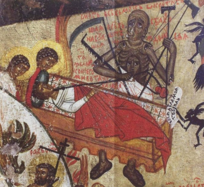 Où la Mort de la dernière icône a-t-elle obtenu autant d'outils différents et que signifient-ils ? Depuis l'Antiquité, la faux est un symbole de la moisson endeuillée et de la mort de l'âme humaine. Cependant, dans la culture slave, l'os apparaît avec une bourse - dans laquelle elle met des outils supplémentaires pour la torture des pécheurs.