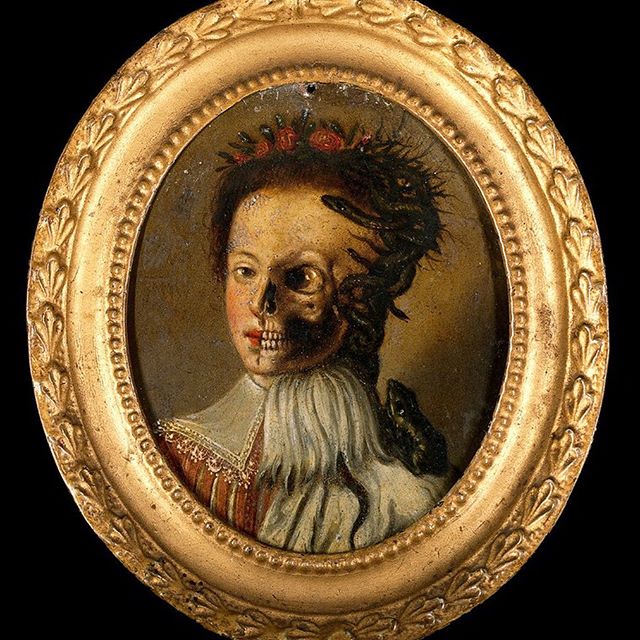 La mort dansait avec un évêque ou un roi, tandis qu'une belle fille était coupée en deux : son jeune corps à gauche et son squelette, infesté de vers de cadavre, à droite.