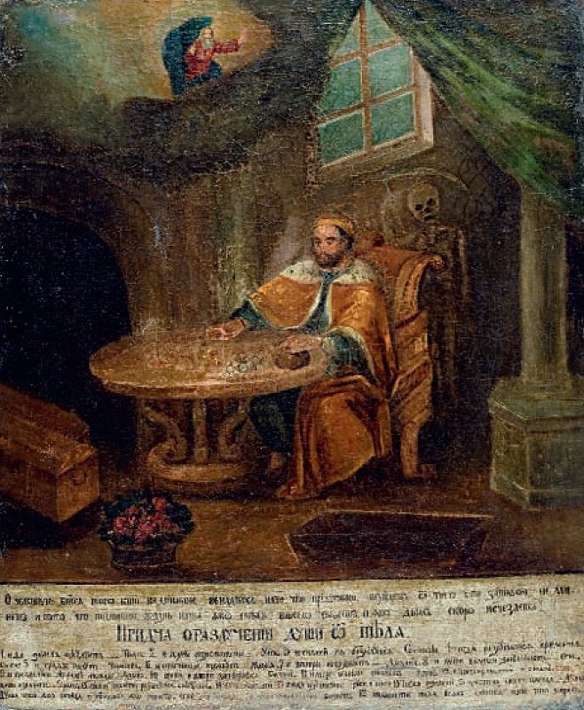 En d'autres termes, pour entrer dans l'autre monde en tant que personne juste et aller au paradis, et non en enfer, il fallait servir le Seigneur (celui qui est peint au-dessus du personnage principal) avec toute la diligence voulue, ne pas compter sur les richesses terrestres (argent et or, couronne et orbe, posés sur la table devant la vierge), ne pas craindre la mort (qui est juste derrière elle) et le tombeau (situé au bas de l'icône).