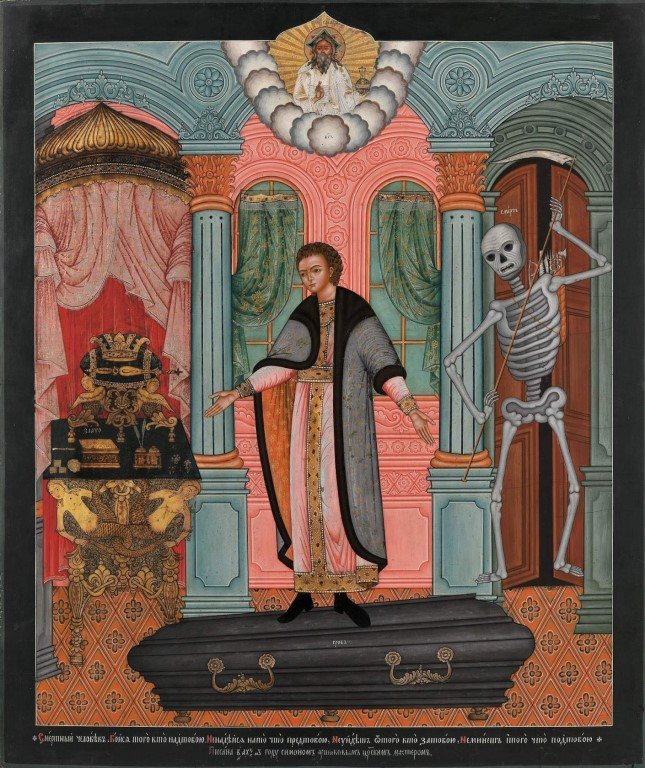 Dans l'icône instructive du roi égyptien Ptolémée Philadelphe avec crâne, clairement tirée d'une gravure occidentale du 18e siècle, le souverain pose sa main sur ce qui était autrefois sa tête, avec la Mort elle-même derrière lui. Devant la règle se trouvent un cercueil et un bouquet flétri, les symboles habituels de la mortalité des choses banales dans Vanitas. En bas, on trouve l'inscription : "O homme, souviens-toi de l'heure de la mort", suivie du texte de la Proclamation pour la séparation de l'âme et du corps.