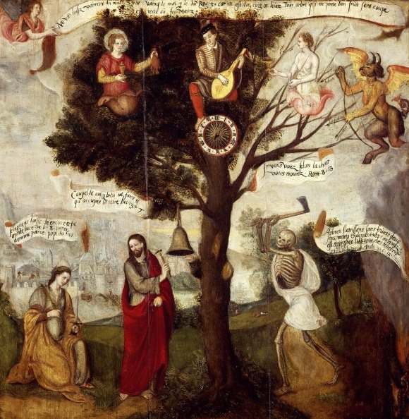 La mort et le démon qui l'assiste sont déjà en train de couper l'arbre et se préparent à l'abattre. Jésus, debout de l'autre côté des cloches de l'église, tente d'avertir les gens de renoncer aux plaisirs du monde et de penser à leur âme.