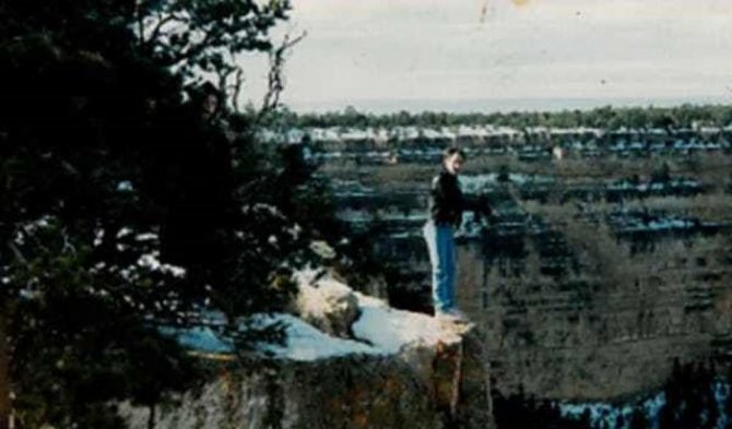À première vue, une photo de touriste ordinaire, sauf qu'elle est légèrement imprudente. Cependant, si vous regardez attentivement, vous pouvez voir un homme avec un mackintosh noir derrière l'homme. Il se tient plus haut sur la pente et domine le héros de la photo. Sa tête est encapuchonnée et son visage pâle est tourné vers la caméra. Bien qu'il n'y ait rien de tragique dans cette image, la silhouette noire est comme un rappel de ce à quoi mène parfois l'insouciance.