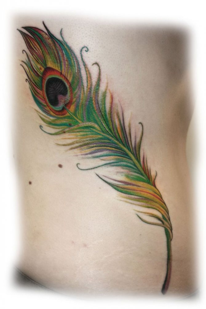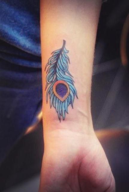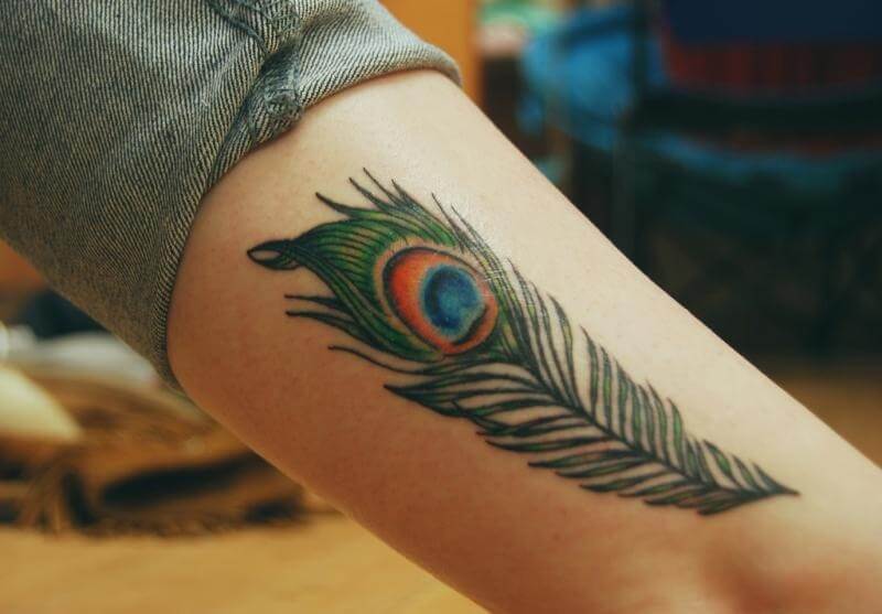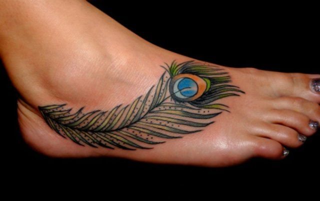 Un tatouage de plumes de paon sur la jambe, sur le côté extérieur de la cuisse, est très joli. Exécuté à l'aide d'une palette de couleurs vives, dans un style réaliste, il peut souligner avec élégance les contours délicats du beau sexe.