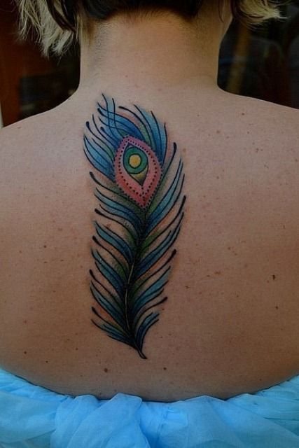 Esquisse d'un tatouage de Plume colorée entre les omoplates pour une femme