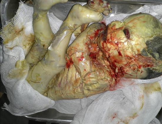 - pseudodysmorphie faciale (symptôme secondaire aux lésions cutanées) : aplatissement du nez, petits lobes rudimentaires, dans certains cas, les oreilles et le nez peuvent être complètement absents ;