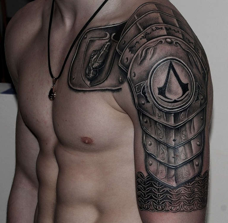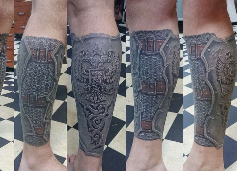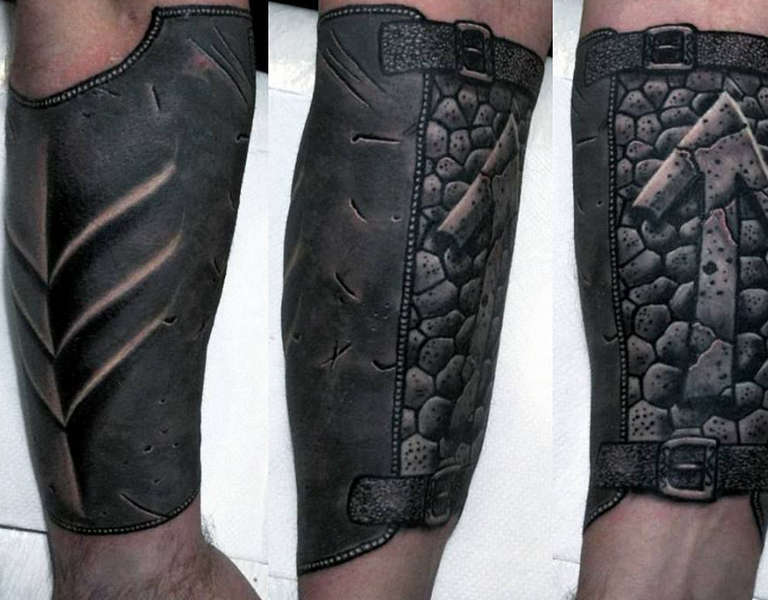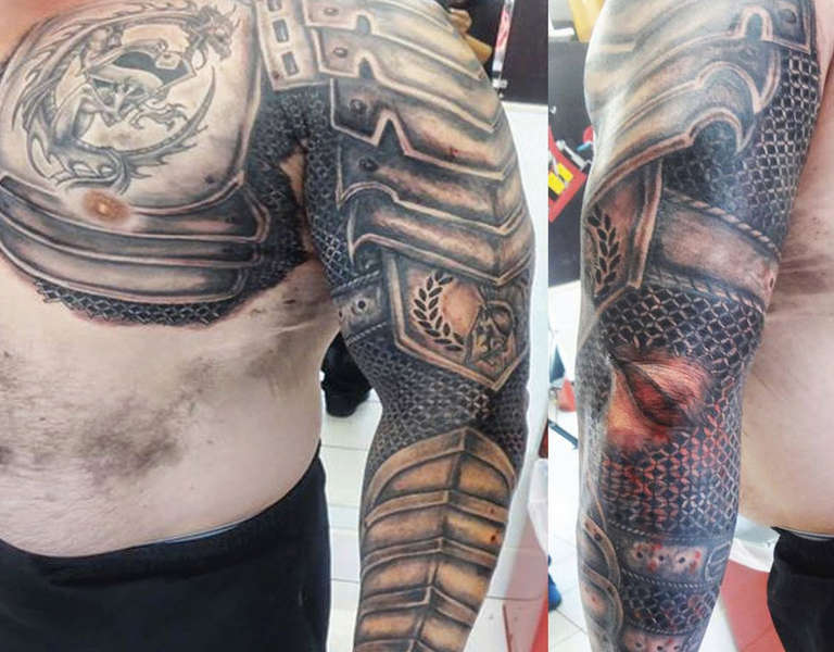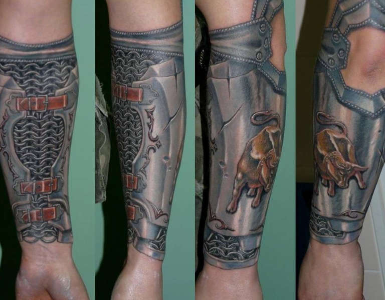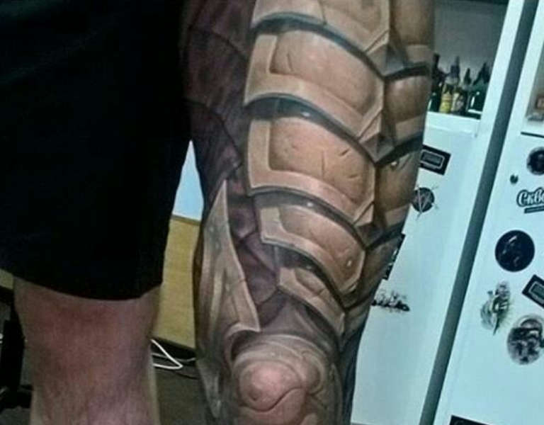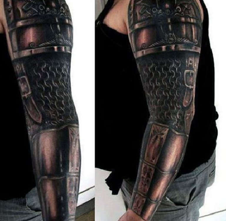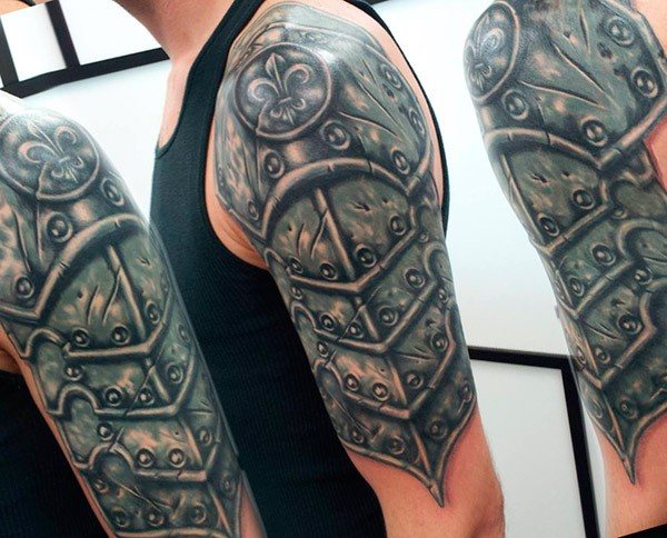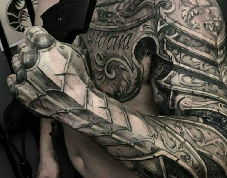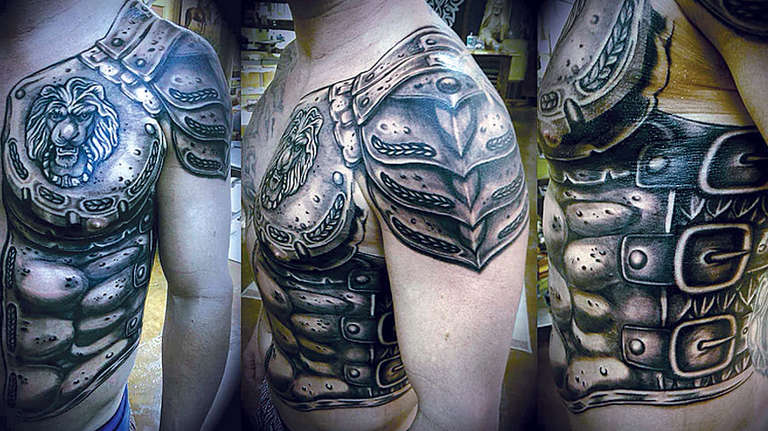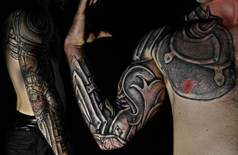 Les croquis aux motifs réalistes de boucliers et d'armures sont de plus en plus populaires et demandés par le sexe fort. Et si, à l'origine, ils étaient principalement rembourrés sur l'avant-bras et l'épaule, ils décorent aujourd'hui presque tout le corps, du cou aux jambes.
