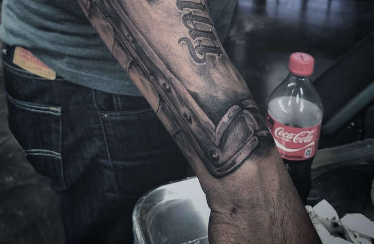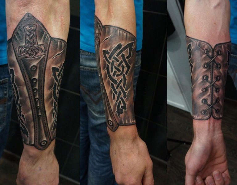 Les images d'armures ont également un aspect cool sur l'avant-bras, surtout si elles sont exécutées avec des ornements polynésiens ou des amulettes slaves. L'aspect fascinant sera l'imitation des lats sous la peau dans le style de la biomécanique, où les mécanismes semblent "s'enfoncer" dans la chair.