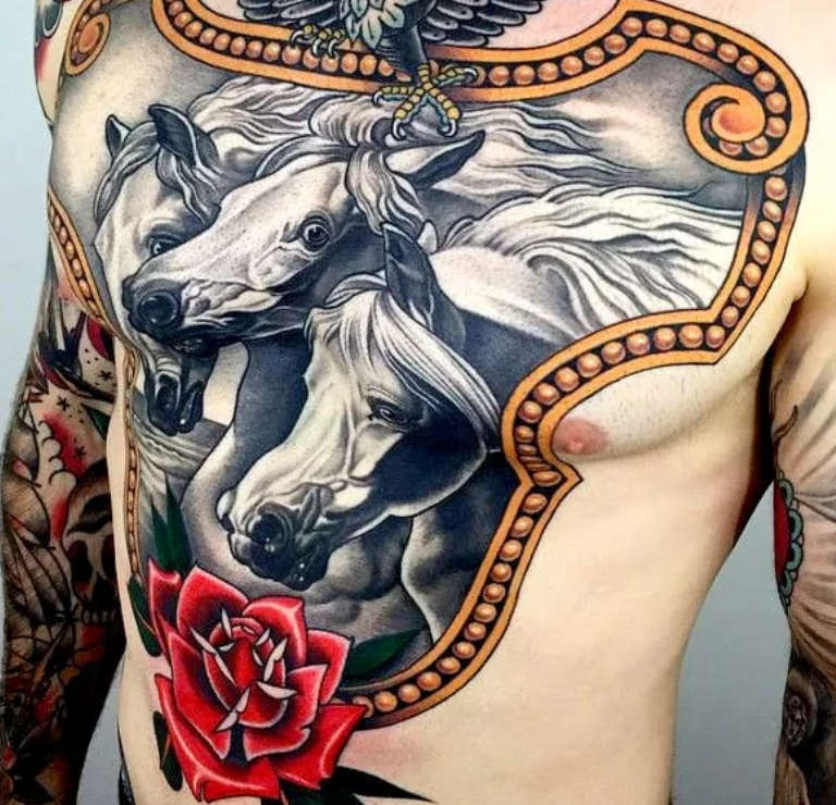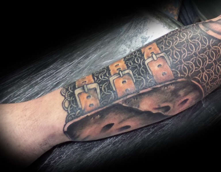 Il y a aussi des tatouages d'armures de chevaliers. Compte tenu de l'image romantique du chevalier, cela n'a rien d'étonnant. Les premiers chevaliers apparaissent dès le 8e siècle chez les Francs. Ils étaient calqués sur l'armée romaine à cheval, mais leur armure, y compris la longue épée droite avec laquelle les chevaliers étaient traditionnellement représentés, provenait des nomades - les Sarmates, les Ostgoths et les Huns.