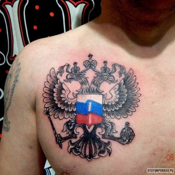 Dans notre État, un tatouage des armoiries russes signifie la dévotion à son pays. Toutefois, il est bien connu que le symbolisme du pays a souvent changé en fonction d'une période historique particulière. Aujourd'hui, il s'agit d'un aigle bicéphale sur un bouclier héraldique rouge. Au-dessus de la tête de l'oiseau se trouvent trois couronnes de Pierre le Grand, représentant les branches législative, exécutive et judiciaire du pouvoir, dans ses pattes - un sceptre et un orbe, et sur le corps - un cavalier avec une lance, tuant un serpent - Saint Georges.