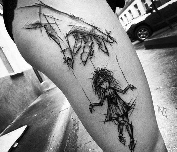 Ce tatouage peut être réalisé dans presque tous les styles. Le facteur décisif pour déterminer la solution stylistique sera le contenu du sujet. Elle est frappante par le nombre d'images de toutes sortes. Il peut s'agir de pinceaux réalistes avec des ficelles, de marionnettes représentant différentes poses, d'autres objets attachés par des ficelles à la place des poupées - un cœur humain, un crâne, un zombie.
