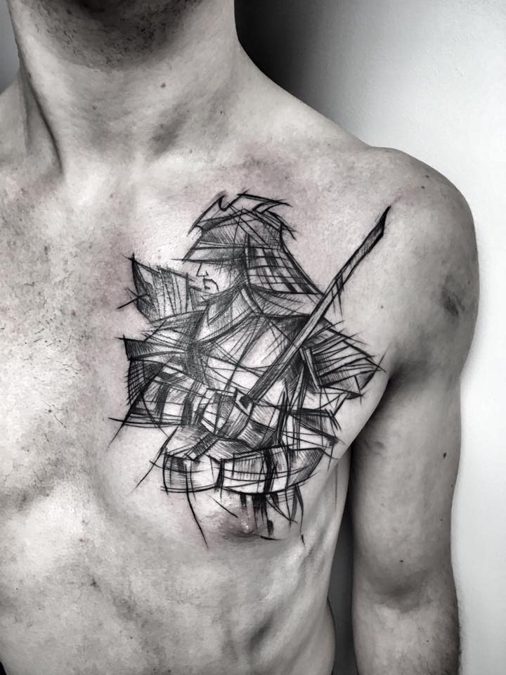 Si vous voulez obtenir l'image originale du samouraï en noir et blanc, demandez au maître de la peindre dans le style Dotwork. Cette technique est assez complexe et tous les professionnels ne sont pas capables d'y travailler, mais si vous faites appel à un vrai professionnel, vous pouvez être sûr d'obtenir un dessin de qualité.