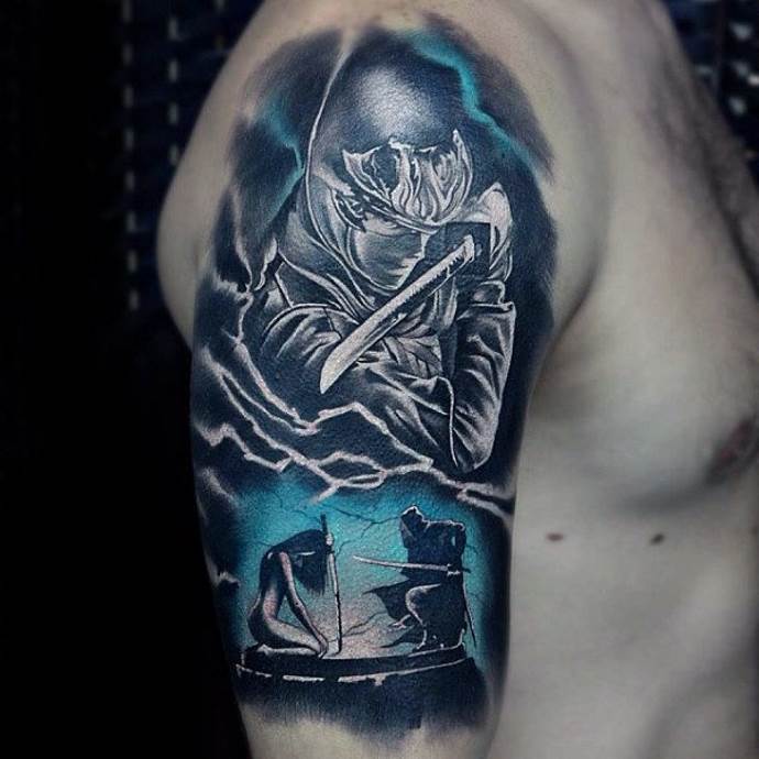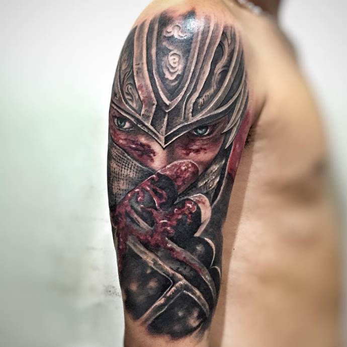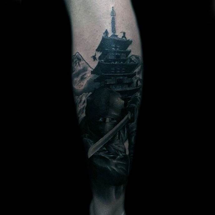 Tatouage ninja stylé et voyant sur le bras dans un style réaliste. Il peut s'agir d'une silhouette de guerrier médiéval devant une tour ou d'un portrait dont le visage est caché derrière un masque et dont seuls les yeux distinctifs sont visibles. Les amateurs de tatouages monochromes peuvent opter pour la technique Dotwork, où l'image peut également être détaillée et proche de la réalité.