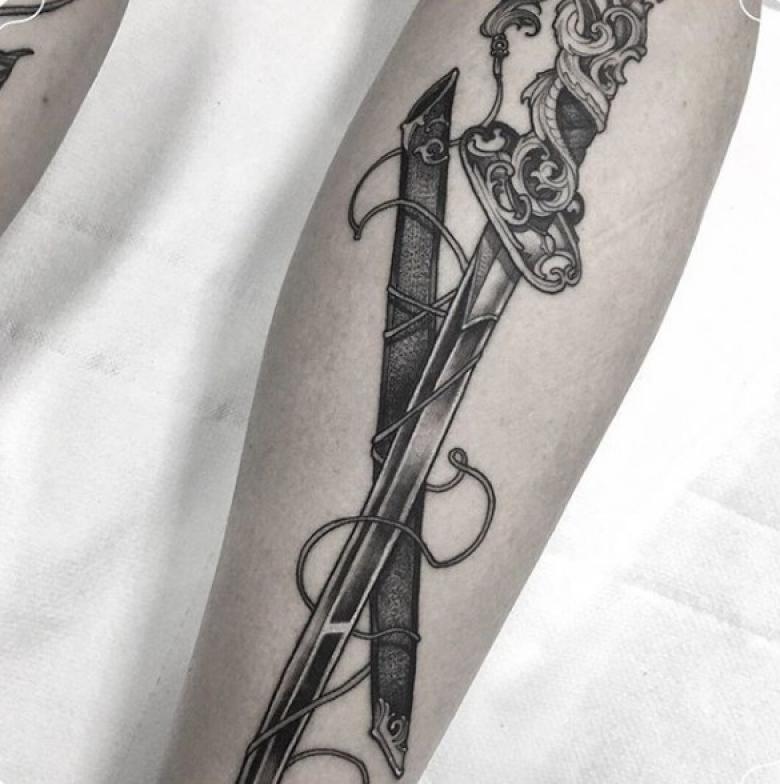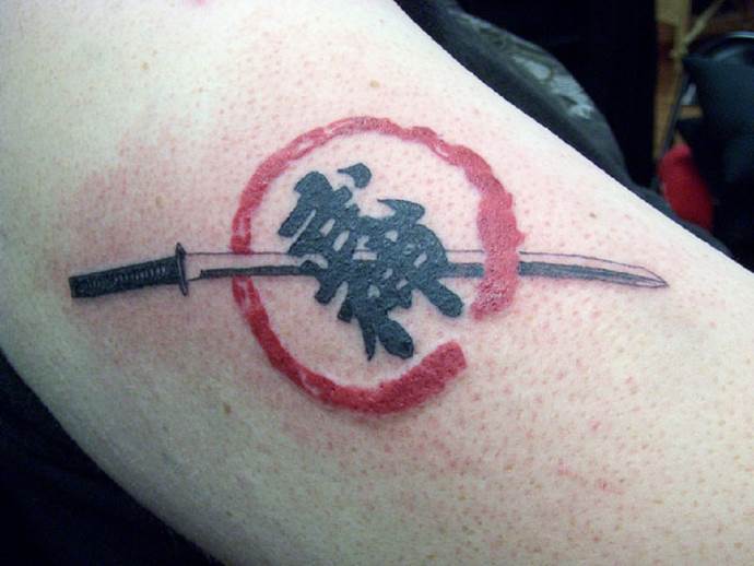 Pour donner à votre image une certaine belligérance, il est recommandé d'appliquer le tatouage sur votre jambe ou votre avant-bras en noir, en le complétant par des traits de "sang" rouges.