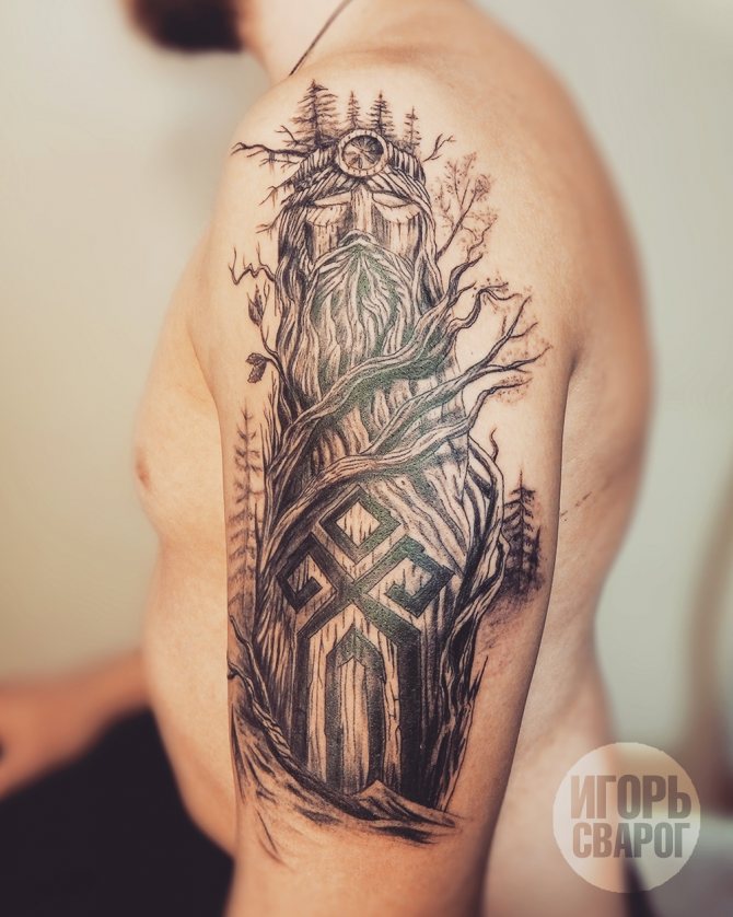 Avant d'appliquer le tatouage sur le corps, il est nécessaire de découvrir de manière fiable à quoi ressemble l'arme de combat de l'ancien dieu slave. Ce qui distingue la hache des armes similaires, c'est sa large lame à double face. Représentent généralement un tatouage avec une ou deux lames. La gravure d'une arme, sur un ou deux côtés, est obligatoire.