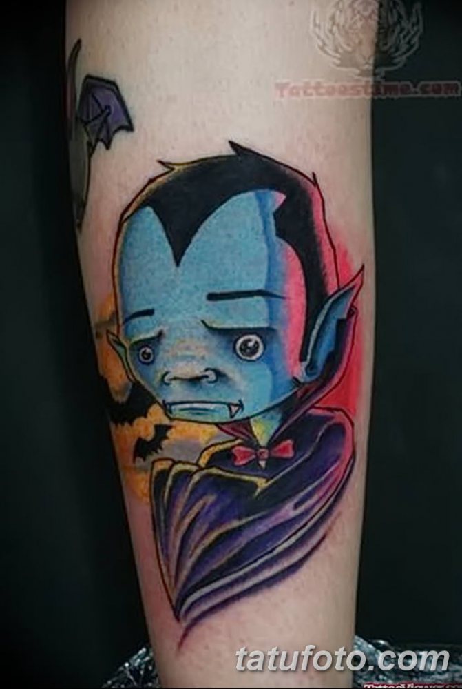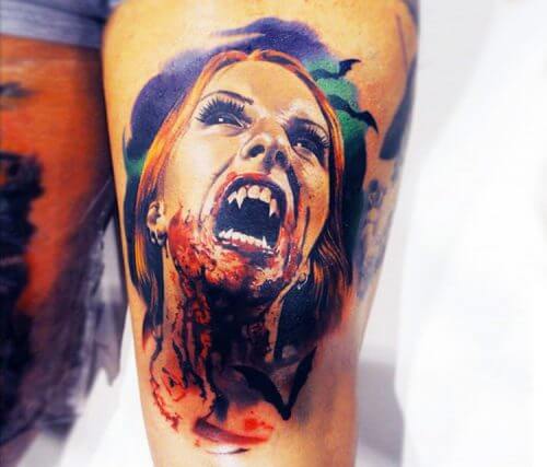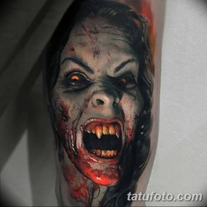 Le tatouage de vampire est souvent fait en raison de l'amour pour les personnages de vampires des films célèbres. Les vampires les plus célèbres de ces films sont From Dusk till Dawn, Blade, The Vampire Diaries, Interview with a Vampire, Twilight, etc. Bien sûr, le vampire le plus populaire de tous les temps est le comte Dracula. L'image pour un tel tatouage est choisie à son gré, ou tirée des nombreux films sur cette personne.