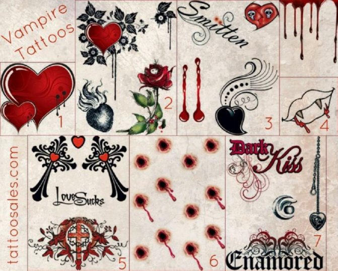 Il y a aussi un tatouage de morsure de vampire. Ce tatouage est commun dans les cercles gothiques. Il ne signifie pratiquement rien et n'est qu'un élément décoratif. Généralement, un tatouage de morsure de vampire est appliqué sur le cou avec de petites gouttes de sang.