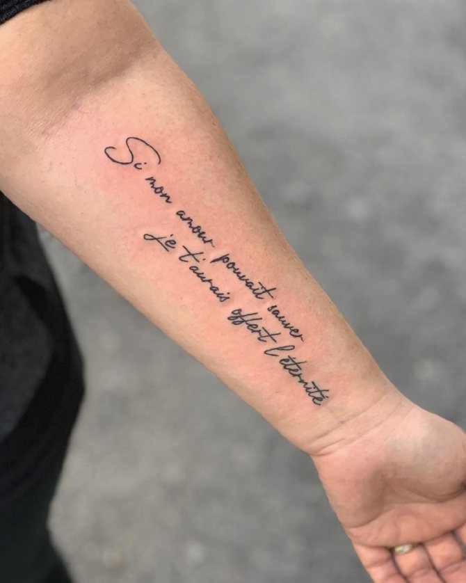 Les phrases d'amour en français sont très populaires parmi les amoureux du tatouage. Ce n'est pas sans raison, Paris est la ville des amoureux. Le tatouage français est idéal pour les poignets, les avant-bras, les côtes, les clavicules et les pieds.