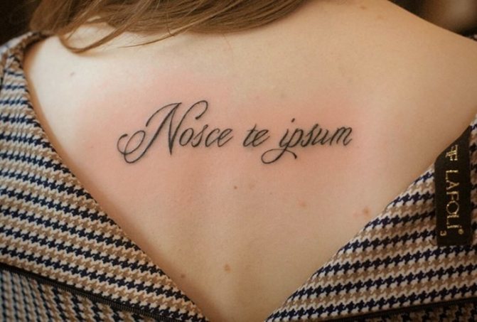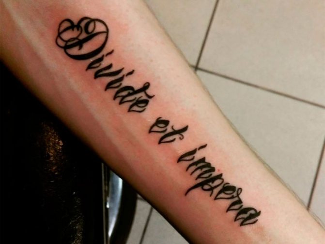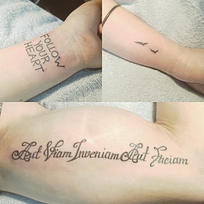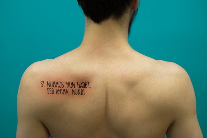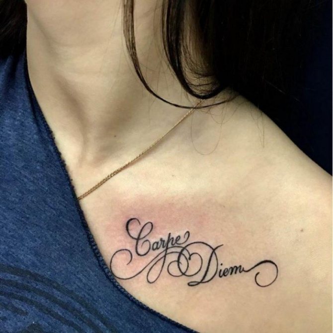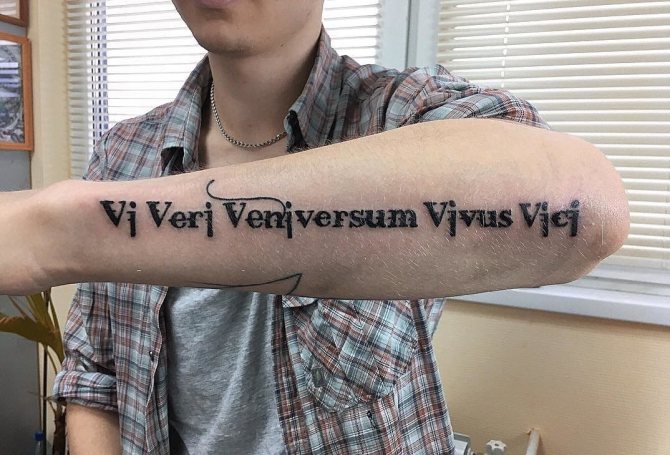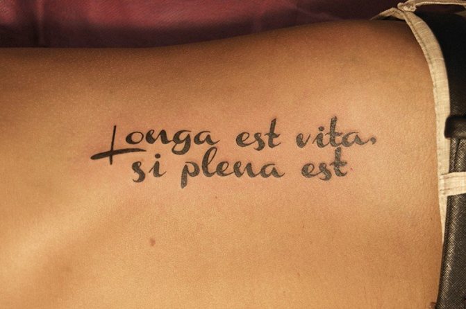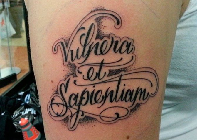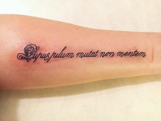 L'emplacement spécifique pour le tatouage d'une inscription latine dépend de la forme et de la taille du texte, ainsi que de la signification de la phrase elle-même. D'accord, un principe sérieux ne peut pas être perçu s'il est tatoué sur une partie inappropriée du corps. Si la ligne est longue, elle peut être joliment placée le long des clavicules, sur le bras de la longueur de l'avant-bras.
