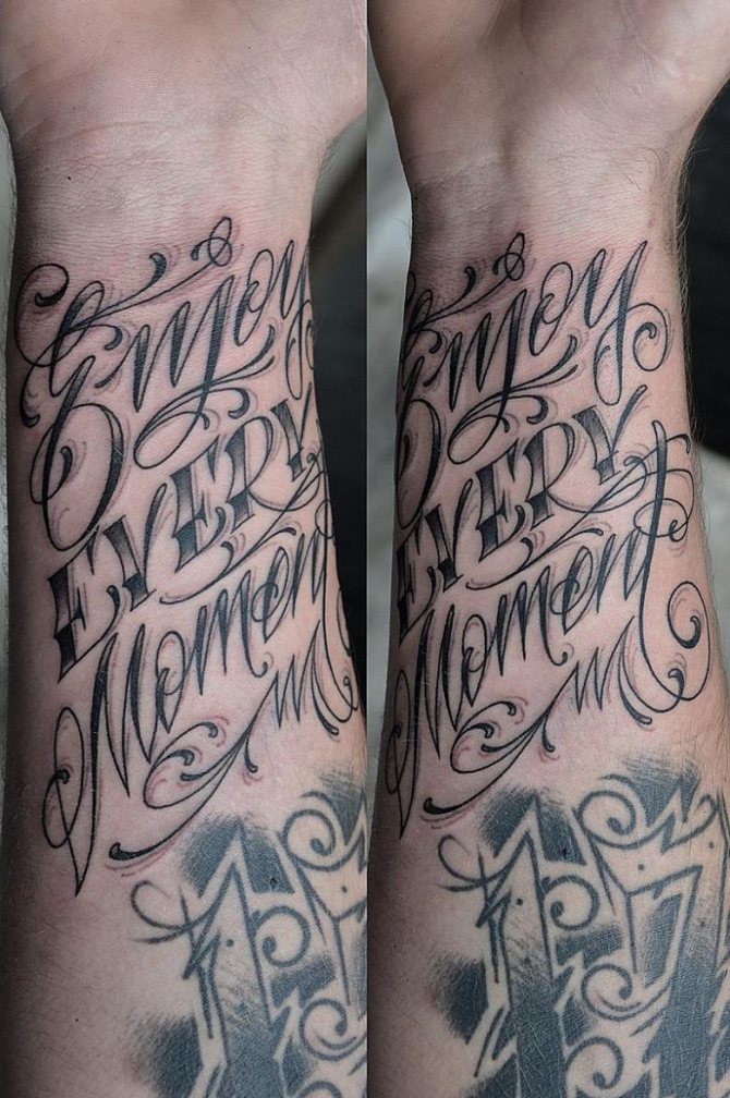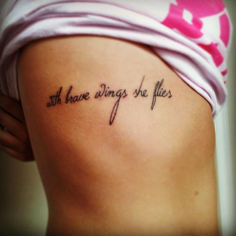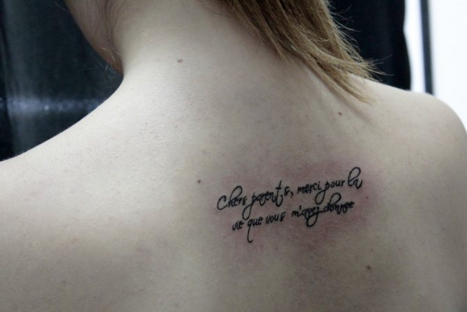 Une petite phrase en petits caractères peut être placée avec succès sur le pied, le poignet, l'épaule ou l'omoplate. Une courte devise semble joliment inscrite au milieu du dos, entre les omoplates, sur la colonne vertébrale. Et il est aussi efficace sur le corps des hommes que sur celui des femmes.