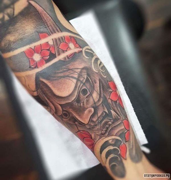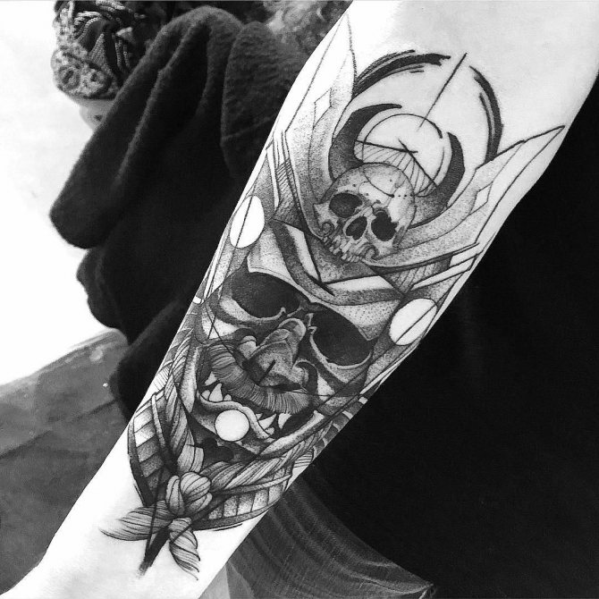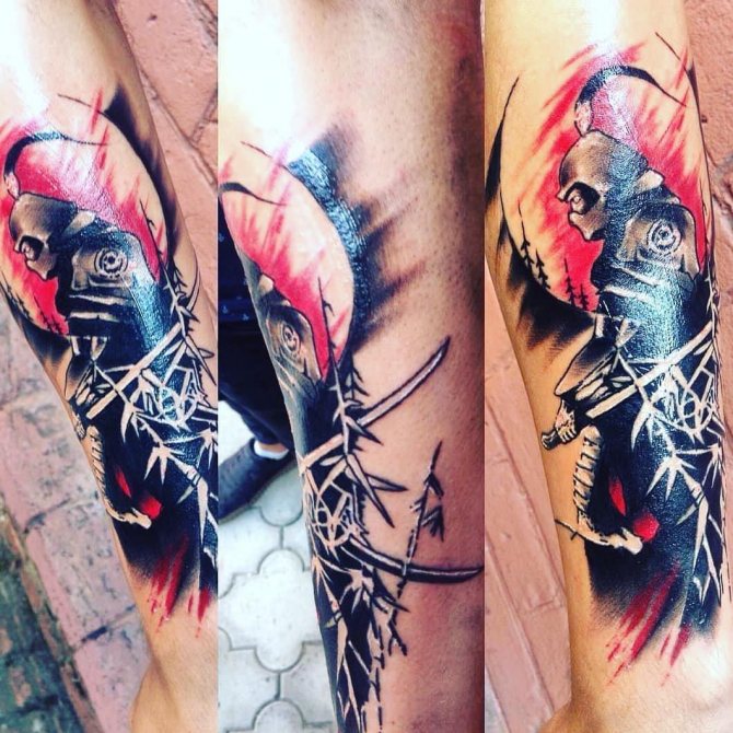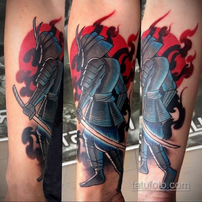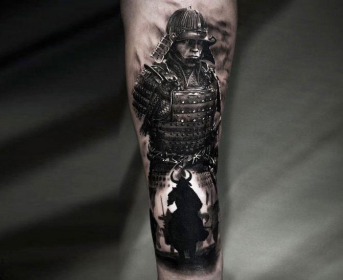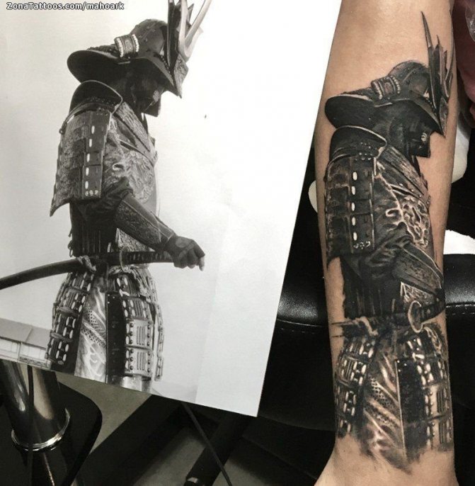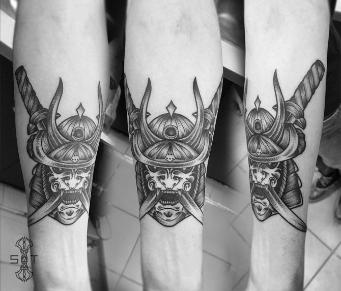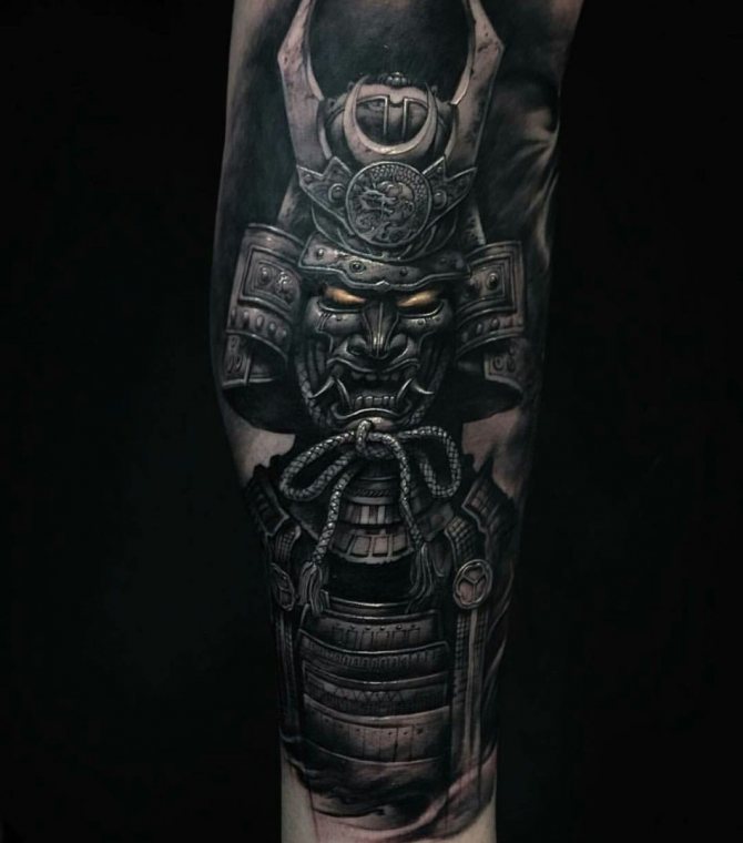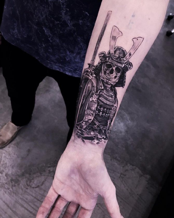 Cette zone du bras est idéale pour un tatouage de taille moyenne. Parmi les motifs populaires, citons les portraits de célèbres samouraïs japonais, les images de guerriers en armure et bien d'autres idées. Sur l'avant-bras, vous pouvez également trouver des amulettes tatouées, des détails d'armures et des croquis montrant les armes des guerriers japonais.