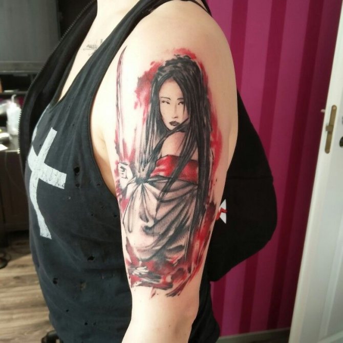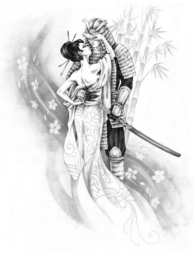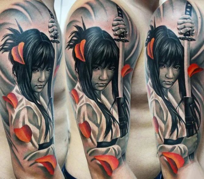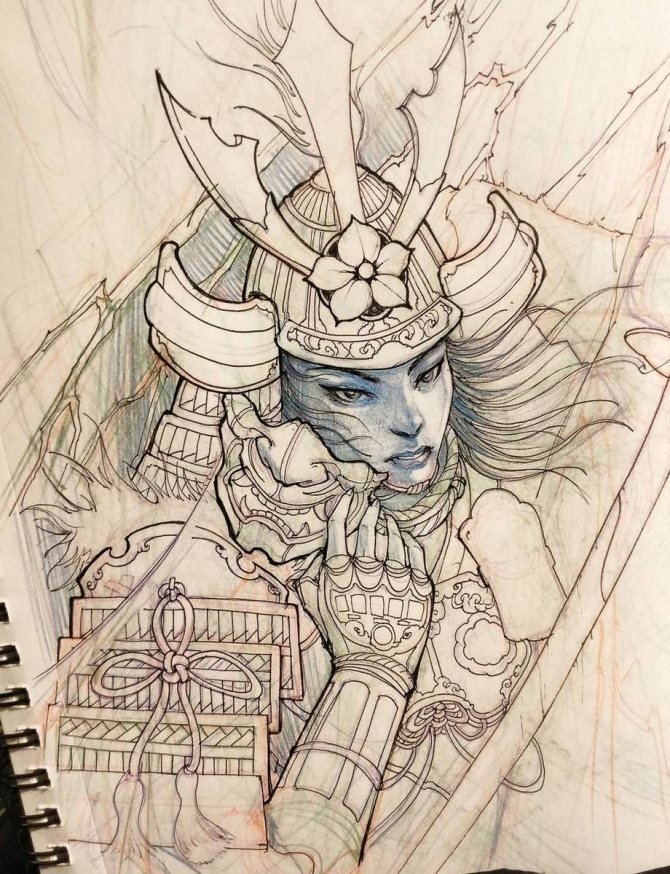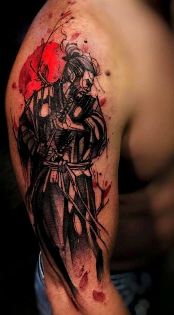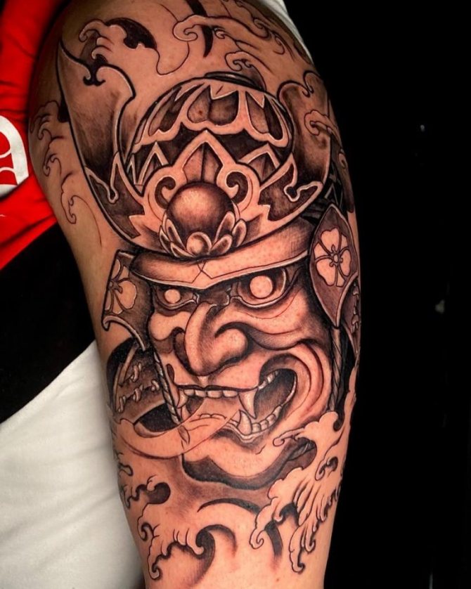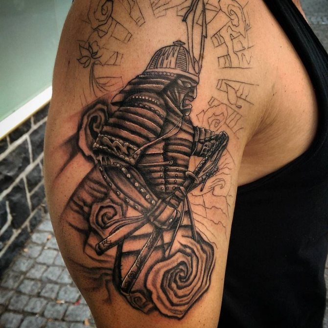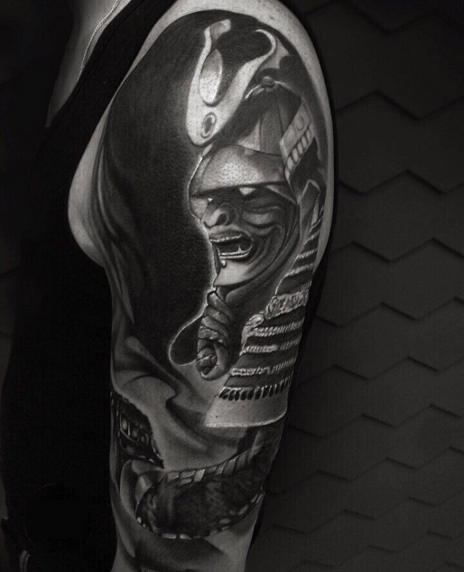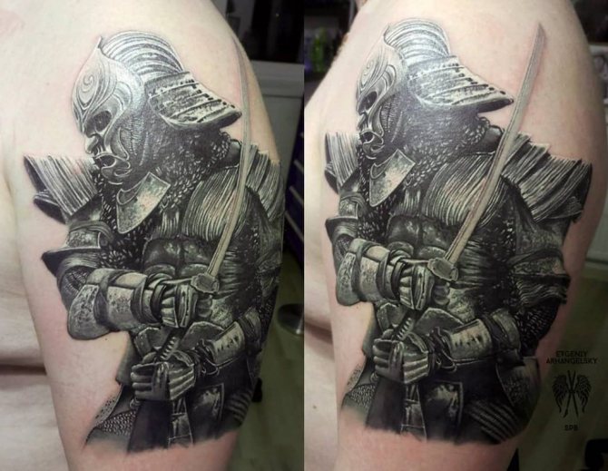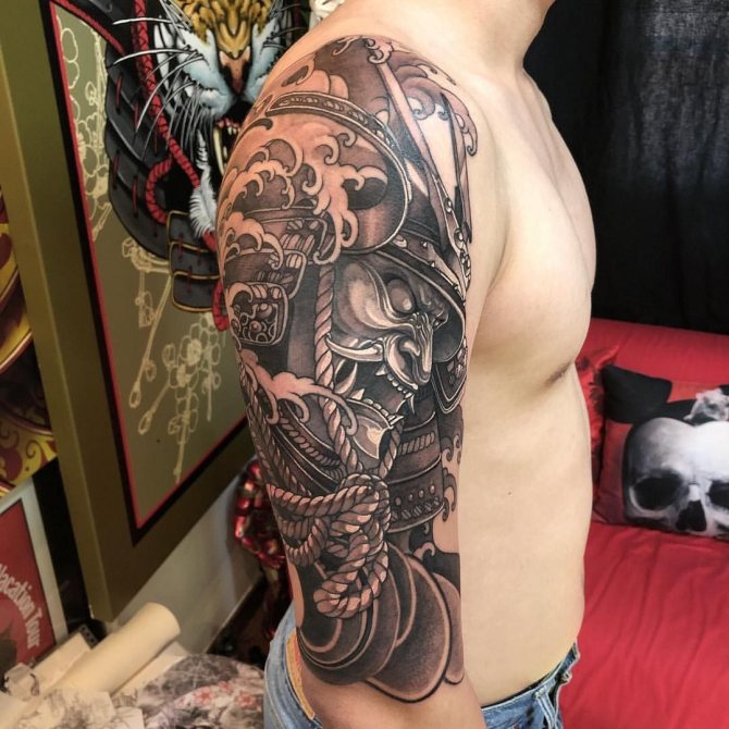 Les croquis les plus appropriés pour l'épaule sont les petits dessins. Les esquisses peuvent représenter le guerrier lui-même en armure, complété par des fleurs de sakura, des bambous ou d'autres dessins de la culture japonaise. Tout dépend de ce que vous voulez montrer. Souvent, un masque ou un casque de samouraï est placé sur votre bras supérieur.
