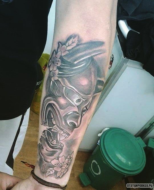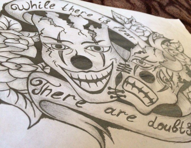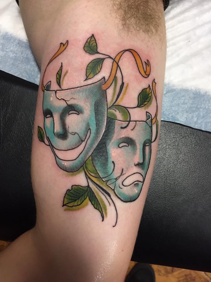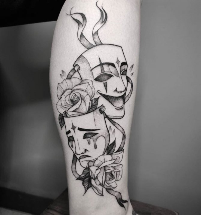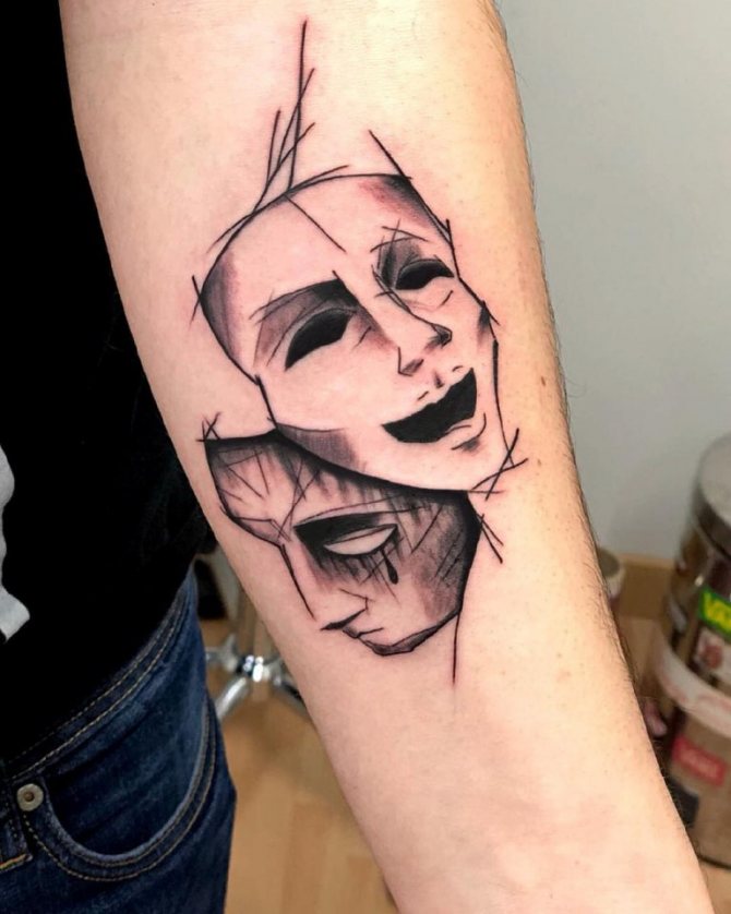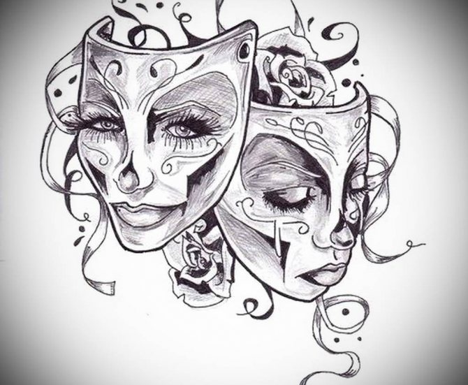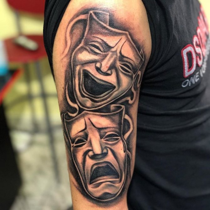 Les masques, qui représentent différentes émotions, étaient portés par les acteurs sur les planches des théâtres de la Rome antique. En guise de tatouage, on représente généralement deux masques représentant des émotions, des qualités de caractère ou des phénomènes opposés. Par exemple, le noir et le blanc, la tristesse et la joie, le bien et le mal, l'amour et la haine.