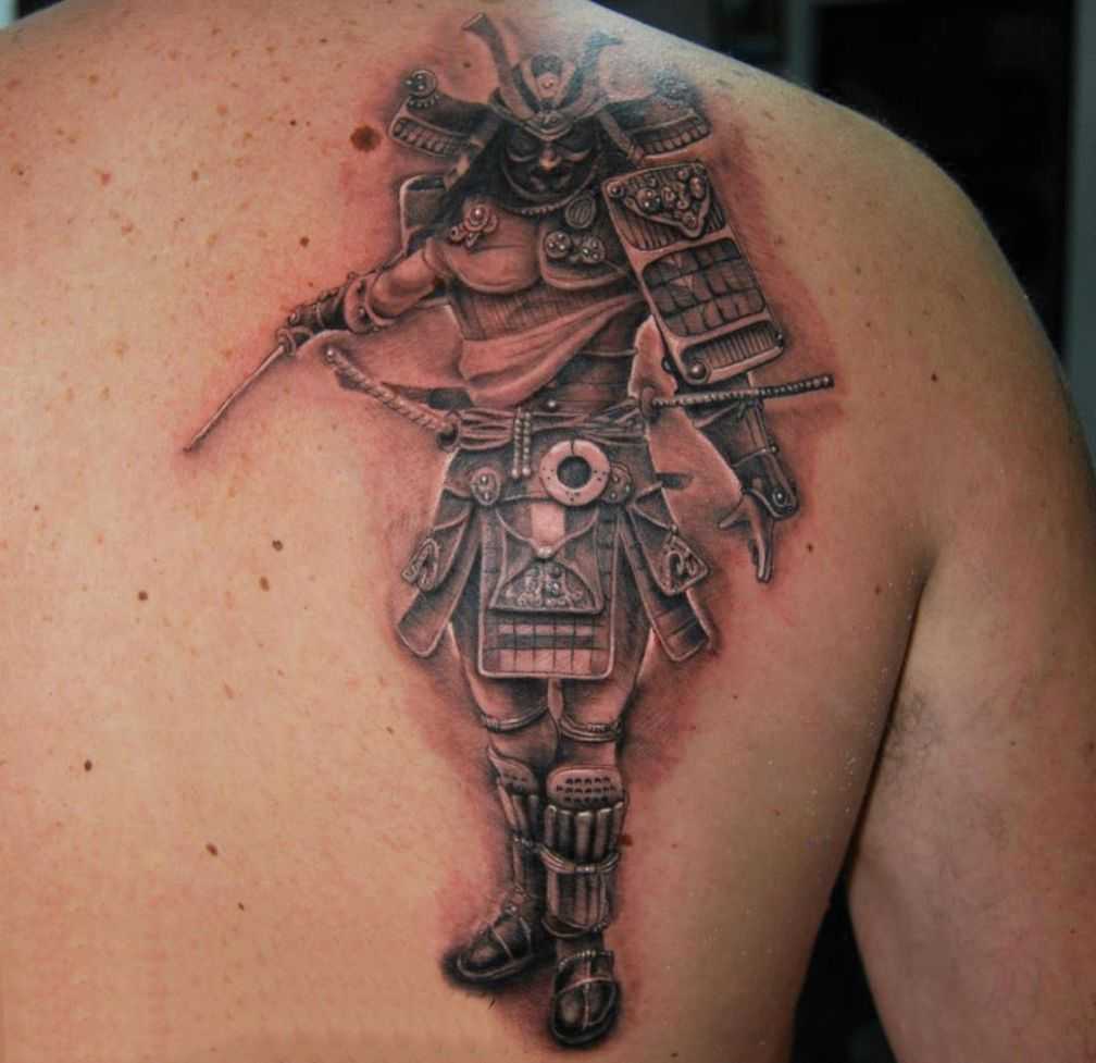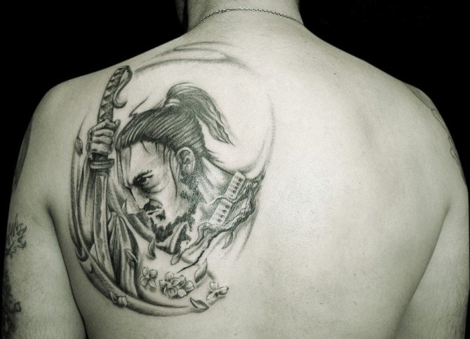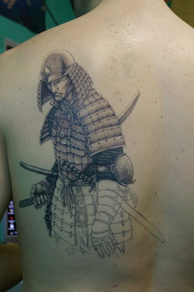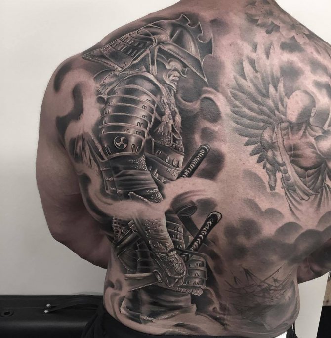 Dans la plupart des cas, le tatouage de samouraï est placé dans le dos. Le choix d'une telle zone, vous permet de faire de grands dessins, car le dos a une faible sensibilité à la douleur. En outre, la zone de "toile" à travailler peut accueillir non seulement une image unique d'un guerrier, mais aussi une impressionnante esquisse d'intrigue, comme le moment du combat du samouraï avec son rival.