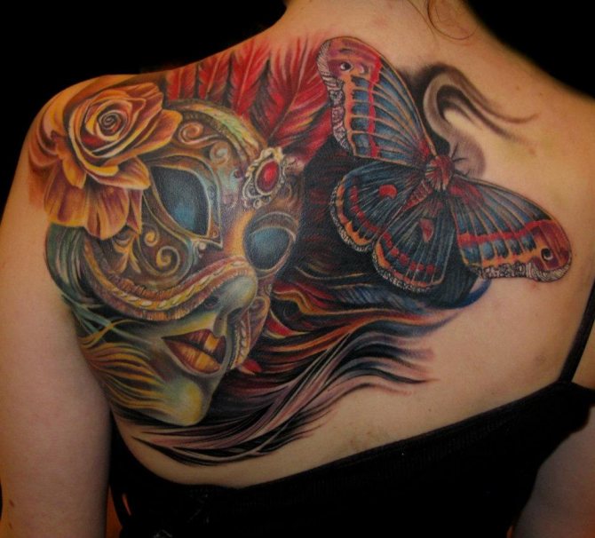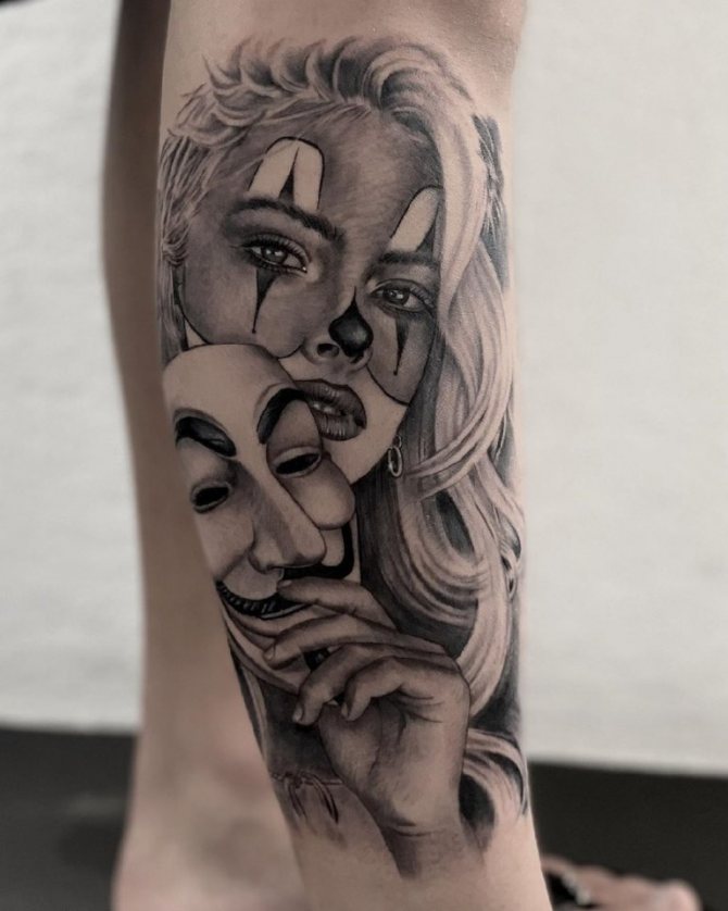 Les masques de bras, aux couleurs vives, sont originaux, tout comme les manches. Dans ce cas, le style newschool est le meilleur, et la pochette peut inclure une composition complète de la scène et des coulisses, de l'auditorium et de la fosse d'orchestre. Le design original présente deux masques sarcastiques - un diable qui rit et un ange qui pleure. La signification d'un tel tatouage est qu'il montre que les bonnes actions peuvent apporter de la douleur et les mauvaises actions du plaisir. Une option chic serait le portrait d'une fille avec un masque vénitien sur le visage, réalisé dans un style réaliste.