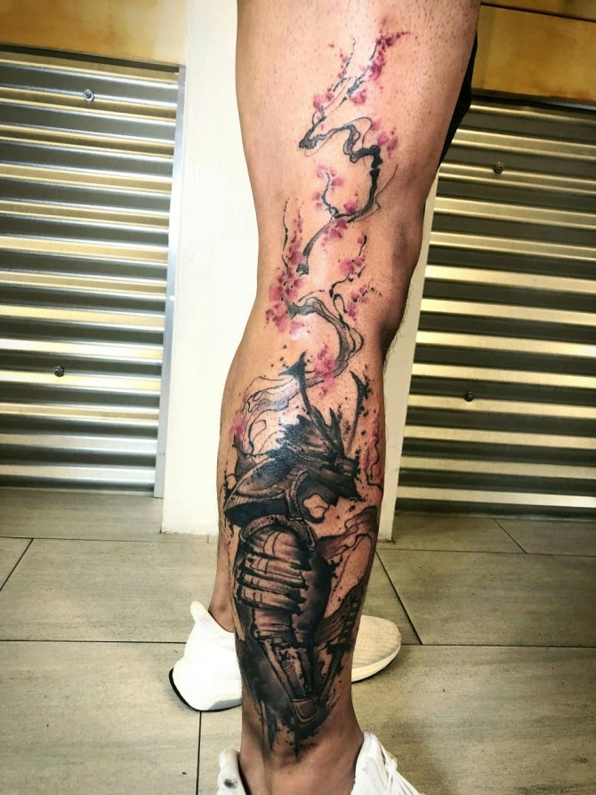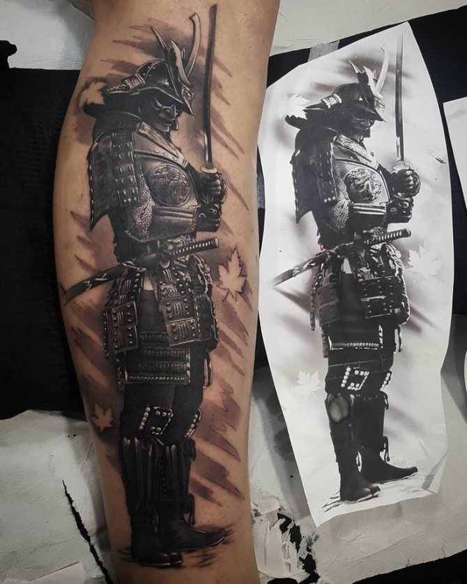 Un tatouage de samouraï sur votre jambe est tout aussi impressionnant. Les dessins peuvent être posés sur la cheville ou la cuisse, en bourrant de petites ou, à l'inverse, d'assez grandes images. Ce type de conception est particulièrement attrayant pour les hommes qui affichent leurs attributs masculins de cette manière.