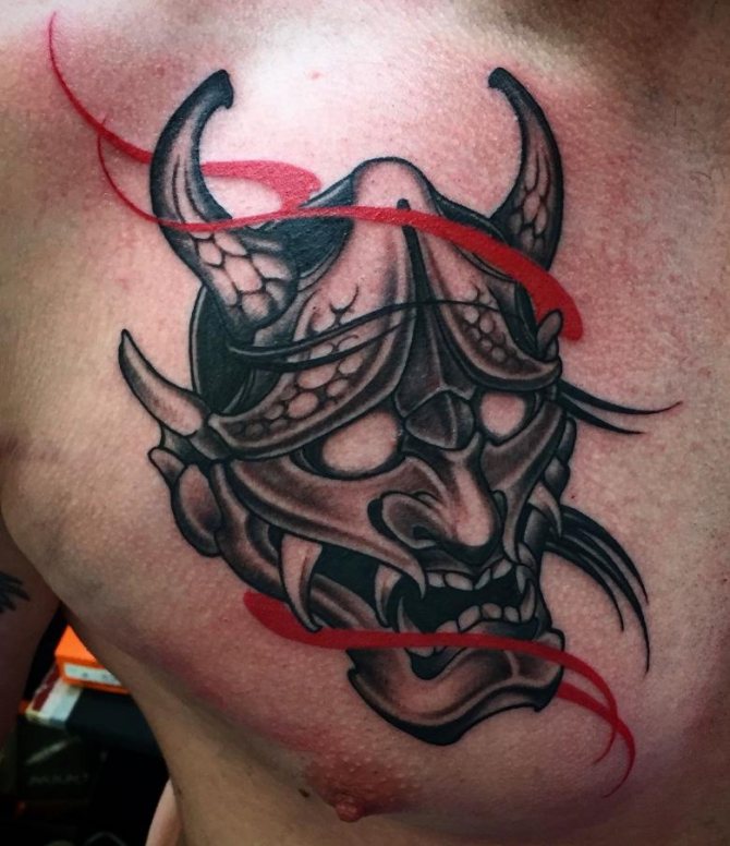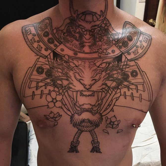Les hommes préfèrent avoir une esquisse comme celle-ci sur une telle zone du corps. Un samouraï ou des éléments de son équipement décorent principalement les muscles pectoraux. L'esquisse peut être petite ou se déplacer sans transition vers l'épaule ou le cou.