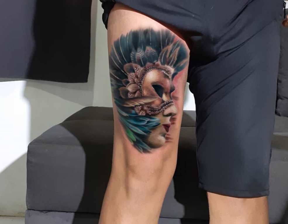 Le masque vénitien est utilisé lors des carnavals et est décoré d'or et de pierres précieuses. Le but du masque est de cacher le vrai visage d'une personne, rendant ainsi tout le monde égal à tout le monde, quel que soit son statut financier ou social. Les gens n'étaient autorisés à porter des masques que lors d'occasions festives ; de nos jours, le tatouage de masque vénitien est le symbole d'un monde justement réaliste et brutal. Le tatouage est aussi attrayant en noir et blanc qu'en couleur.