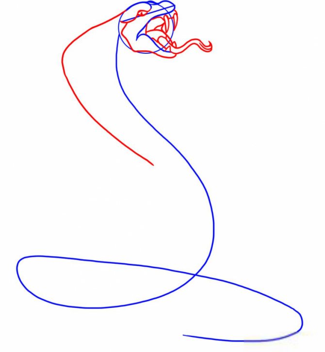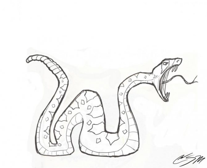 - Tout d'abord, vous devez comprendre comment dessiner le corps du serpent avec un crayon, et seulement sa partie inférieure. La partie supérieure est dessinée dans les étapes suivantes, comme la partie la plus difficile de l'image. Ainsi, une sorte de "corde" est dessinée, posée en anneaux. Voici les grandes lignes ;