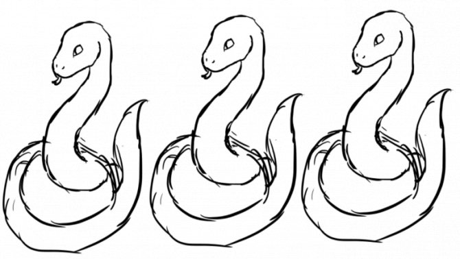 D'abord, dessinez la tête du serpent. Il aura la forme d'un ovale. Puis, d'un trait, essayez de décrire la direction du mouvement de notre serpent, pour saisir sa plasticité. Ensuite, nous montrons l'épaisseur du corps de notre serpent. Il est possible de corriger quelque chose quelque part, si au départ nous avons mis une mauvaise ligne, mais il est préférable de le faire tout de suite, au stade initial.