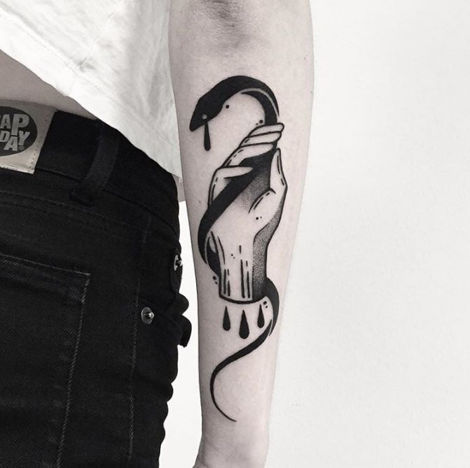 Le tatouage serpent et dague est de nature anti-militaire. Ce motif peut être interprété comme une volonté de lutter contre les imperfections, les faiblesses et les tentations. Et la deuxième signification est le désir de se battre, de détruire quelque chose d'ancien au nom du nouveau.