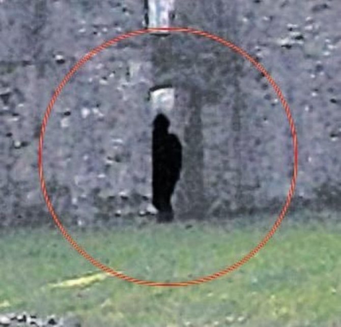 Il s'agit d'un fragment fortement agrandi d'une photo de famille mise en ligne pour mettre en garde ceux qui pensent que tous les clichés supposés de mystérieuses silhouettes sombres ne sont que des jeux d'ombre et de lumière habilement capturés par le photographe. Ici, une grande silhouette noire encapuchonnée et sans visage est clairement visible par une journée ensoleillée contre un mur lumineux, et ne permet à personne de douter de sa réalité.