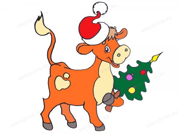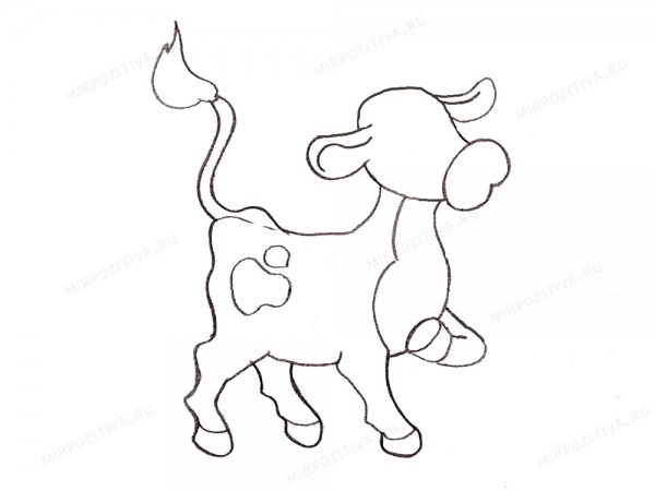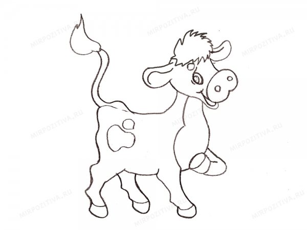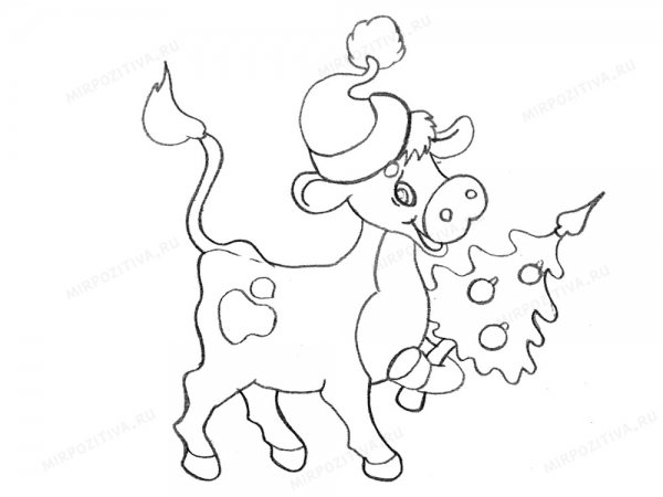Gavryusha est un petit taureau mignon et actif du dessin animé "Trois de Prostokvashino". Vous pouvez utiliser son image pour décorer une carte de Nouvel An, signe que l'année à venir sera joyeuse et heureuse, et qu'elle passera sous le symbole du taureau blanc. Si votre enfant fréquente la classe 1 ou 2, il peut réaliser le schéma de dessin suivant.