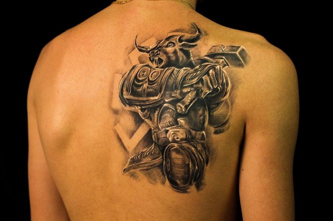 Un tatouage de taureau peut être présenté de manière totalement différente. Par exemple, les dessins de minotaures sont très inhabituels et élégants. Surtout s'ils sont réalisés dans un style réaliste, avec le dessin de tous les détails. L'essentiel est qu'il s'agit d'une œuvre réalisée par un artiste vraiment talentueux, qui travaille dans le sens du réalisme.