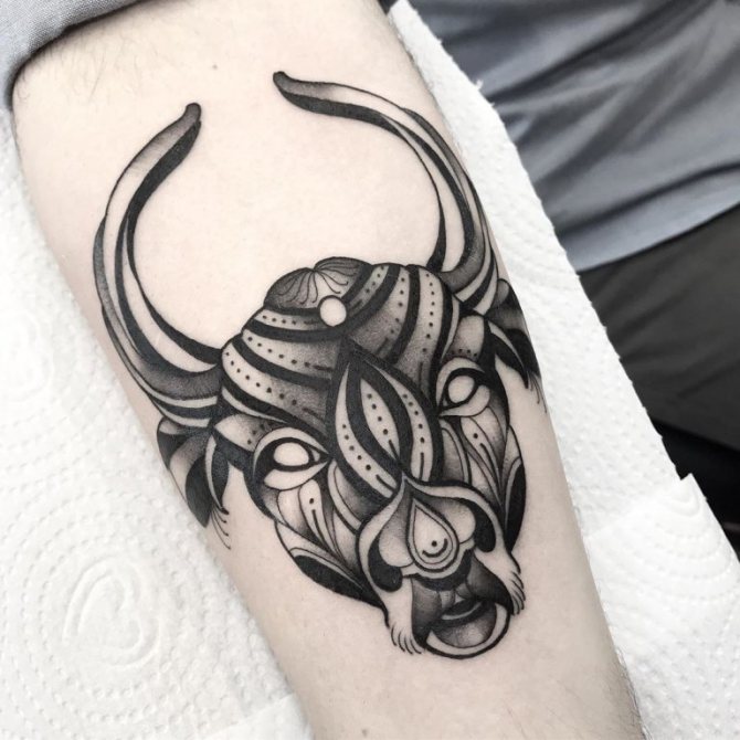 Selon le style d'exécution du tatouage, sa signification peut varier. Le crâne d'un taureau joue également un rôle important dans la signification de l'image et la présence d'éléments supplémentaires. Le tatouage de crâne de taureau, réalisé dans le style celtique, symbolise la puissance d'un guerrier et la force. Le plus souvent, ce tatouage convient aux personnes qui ont participé à des combats.