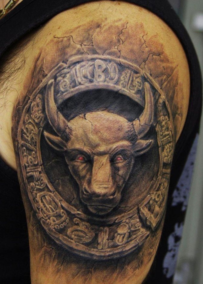 Le tatouage de taureau est particulièrement vénéré dans le monde entier. Il est particulièrement adapté aux hommes. Le taureau est le chef de la famille, qu'il saura toujours protéger. C'est le chef de la famille, qu'il pourra toujours protéger. Le porteur du tatouage est porteur d'une puissante énergie sexuelle et de la capacité de reproduire un certain nombre de descendants jusqu'à un âge avancé. Les personnes qui réalisent des tatouages avec un taureau sur le dos se distinguent généralement par une endurance exceptionnelle et la particularité de se remettre d'une chute mortelle.