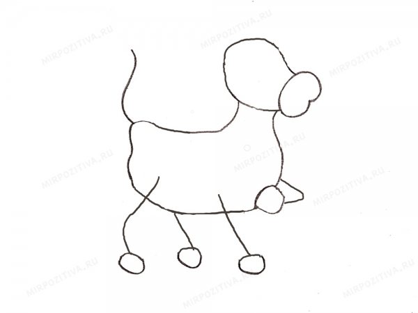 Rendre les pieds et la queue épais. Souligner les parties saillantes au-dessus du sabot et plus près de la base. Faites un pompon au bout de la queue. Ajoutez des taches sur le côté. Dessinez les oreilles.
